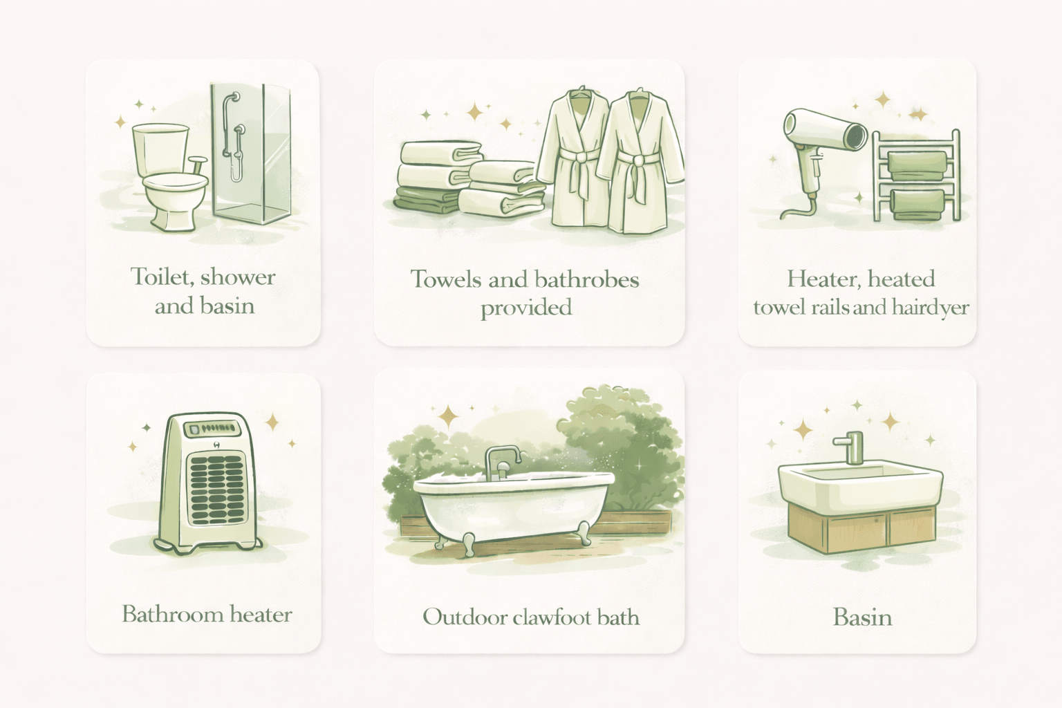 After a relaxing outdoor soak, wrap up in one of our 100% cotton robes and step into the adjacent bathroom shed to refresh with a hot shower if you wish.