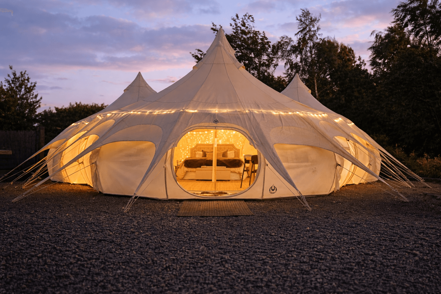 Step into something truly special — a spacious 65m² open-plan glamping tent thoughtfully designed for both relaxation and comfort. Beautifully styled interiors, subtle lighting, and natural materials come together to create a warm, cosy space that feels relaxed and refined.